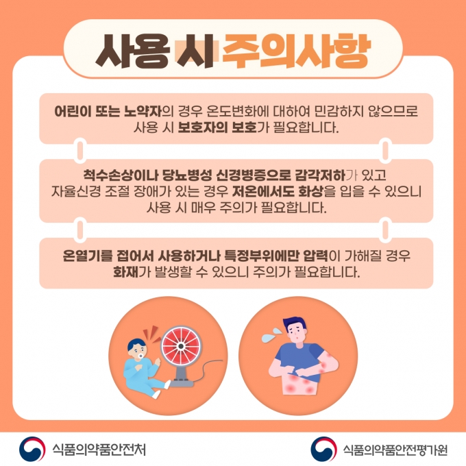 Àú¿ÂÈ»óÀ» ÀÔÀ¸¸é ÇǺΰ¡ ºÓ°Ô ´Þ¾Æ¿À¸£°Å³ª ¹°Áý, ÅëÁõ, °¨°¢ÀÌ»ó µîÀÌ ³ªÅ¸³´Ù. ÀÌ °æ¿ì Áï½Ã »ç¿ëÀ» ¸ØÃß°í º´¿øÀ» ¹æ¹®ÇÏ´Â °Ô ¹Ù¶÷Á÷ÇÏ´Ù. ½Ä¾àó´Â "¾î¸°À̳ª ³ë¾àÀÚ, ÀÓ»êºÎ, °Åµ¿ÀÌ ºÒÆíÇÑ »ç¶÷, ´ç´¢º´ µîÀ¸·Î ÀÎÇØ ¸»ÃʼøÈ¯Àå¾Ö°¡ ÀÖ¾î ¿Âµµ°¨°¢ÀÌ ¶³¾îÁö´Â »ç¶÷Àº ´õ À§ÇèÇÏ´Ù"¸ç "°¡±ÞÀû »ç¿ëÇÏÁö ¾Ê°Å³ª »ç¿ëÇÏ´õ¶óµµ º¸È£ÀÚ°¡ ¿Âµµ¿Í ½Ã°£À» ÇÔ²² È®ÀΡ¤°ü¸®ÇØ¾ß ÇÑ´Ù"°í Á¶¾ðÇß´Ù.