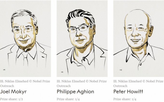 ¿ÃÇØ ³ëº§ °æÁ¦ÇÐ»ó ¿µ¿¹´Â 'Çõ½Å ÁÖµµ ¼ºÀå' ¿¬±¸¿¡ ±â¿©ÇÑ 3¸íÀÇ ÇÐÀÚ¿¡°Ô µ¹¾Æ°¬´Ù. Á¶¿¤ ¸ðŰ¾î(Joel Mokyr) ³ë½º¿þ½ºÅÏ´ë ±³¼ö, Çʸ®ÇÁ ¾Æ±â¿Ë(Philippe Aghion) ÄÝ·¹ÁÖ µå ÇÁ¶û½º ±³¼ö, ÇÇÅÍ È£À§Æ®(Peter Howitt) ºê¶ó¿î´ë ¸í¿¹±³¼ö°¡ ±× ÁÖÀΰøµé´Ù.