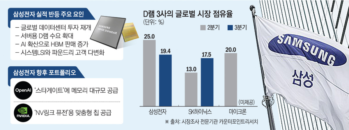ÀÌ °°Àº »ê¾÷ È帧 ¼Ó¿¡¼ »ï¼ºÀüÀÚ´Â ±Û·Î¹ú D·¥ ½ÃÀå 1À§ ÀÚ¸®¸¦ ŻȯÇß´Ù. ½ÃÀåÁ¶»ç±â°ü Ä«¿îÅÍÆ÷ÀÎÆ®¸®¼Ä¡´Â À̳¯ ¡°»ï¼ºÀüÀÚ´Â 1ºÐ±â D·¥ ½ÃÀå 1À§¸¦ SKÇÏÀ̴нº¿¡ ³»ÁØ µ¥ À̾î 2ºÐ±â¿£ ¸Þ¸ð¸® ½ÃÀå Àüü 2À§·Î ¹Ð·ÈÀ¸³ª, 3ºÐ±â µé¾î ¹ü¿ë D·¥°ú ³½µå ¼ö¿ä °¼¼¿¡ ÈûÀÔ¾î ´Ù½Ã 1À§¸¦ µÇã¾Ò´Ù¡±°í ¹àÇû´Ù. »ï¼ºÀüÀÚ¿Í SKÇÏÀ̴нº´Â ¿ÃÇØ 3ºÐ±â ½ÃÀåÁ¡À¯À²ÀÌ 2ºÐ±â ´ëºñ °¢°¢ 25%, 13%¾¿ »ó½ÂÇØ 19.4%, 17.5%¸¦ ±â·ÏÇß´Ù. ÀÌ´Â ½ÇÀû ¹ÝµîÀÇ ¹è°æÀÌ ´Ü¼øÇÑ ÀÏȸ¼º È£Á¶°¡ ¾Æ´Ï¶ó, ¸Þ¸ð¸® ½ÃÀå Àü¹ÝÀÇ ±¸Á¶Àû ȸº¹¼¼¿Í ¸Â¹°·Á ÀÖ´Ù´Â Àǹ̷ΠǮÀ̵ȴÙ.