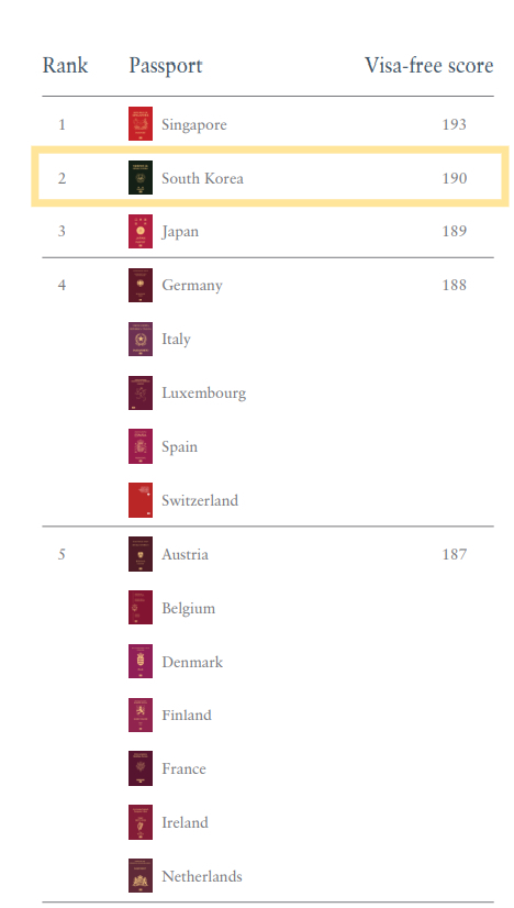 1À§´Â 193°³±¹¿¡ ¹«ºñÀÚ ÀÔ±¹ÀÌ °¡´ÉÇÑ ½Ì°¡Æ÷¸£À̰í, 3À§´Â ÀϺ»(189°³±¹ ¹«ºñÀÚ ÀÔ±¹)ÀÌ´Ù. 4À§¿¡´Â µ¶ÀÏ, ÀÌÅ»¸®¾Æ, ·è¼ÀºÎ¸£Å©, ½ºÆäÀÎ, ½ºÀ§½º(188°³±¹)°¡ Â÷ÁöÇß°í, 5À§´Â ¿À½ºÆ®¸®¾Æ, º§±â¿¡, µ§¸¶Å©, ÇÁ¶û½º, ¾ÆÀÏ·£µå, ³×´ú¶õµå(187°³±¹)¿´´Ù.