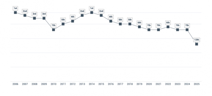 ¹Ì±¹Àº ¿©±Ç ÆÄ¿ö¸¦ ÃøÁ¤ÇØ ¿Â 20³â ¿ª»ç»ó óÀ½À¸·Î 10À§±Ç ¾Æ·¡·Î ¶³¾îÁ³´Ù. ¹Ì±¹ÀÇ ¿©±Ç ÆÄ¿ö´Â ¹«ºñÀÚ ÀÔ±¹ °¡´É±¹ ¼ö°¡ 180°³±¹ÀÎ ¸»·¹ÀÌ½Ã¾Æ¿Í °°Àº 12À§´Ù. Å©¸®½ºÆ¼¾È ͏° Ç¾ØµåÆÄÆ®³Ê½º ȸÀåÀº "¹Ì±¹ÀÇ ¿©±Ç ÆÄ¿ö Ç϶ôÀº ±Û·Î¹ú À̵¿¼º°ú ¼ÒÇÁÆ®ÆÄ¿ö ¿ªÇÐ °ü°èÀÇ ±Ùº»ÀûÀÎ º¯È¸¦ º¸¿©ÁÖ´Â ½ÅÈ£"¶ó¸ç "´Ü¼øÇÑ ¼øÀ§ º¯µ¿ ÀÌ»óÀÇ Àǹ̰¡ ÀÖ´Ù"°í Æò°¡Çß´Ù. À̾î "°³¹æ¼º°ú Çù·ÂÀ» ¼ö¿ëÇÏ´Â ±¹°¡µéÀº (¿©±Ç ÆÄ¿ö Áö¼ö¿¡¼) ¾Õ¼ ³ª°¡°í ÀÖ°í, °ú°ÅÀÇ Æ¯±Ç¿¡ ¾ÈÁÖÇÏ´Â ±¹°¡µéÀº µÚóÁö°í ÀÖ´Ù"°í ÁöÀûÇß´Ù.