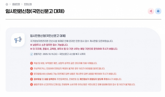 °æ±â ³²¾çÁֽô ±¹°¡Á¤º¸ÀÚ¿ø°ü¸®¿ø ÈÀç·Î ±¹¹Î½Å¹®°í ½Ã½ºÅÛÀÌ Áߴܵʿ¡ µû¶ó ½Ã¹Î ºÒÆíÀ» ÁÙÀ̱â À§ÇØ ½Ã ȨÆäÀÌÁö¿¡ Àӽà ¹Î¿ø Á¢¼ö ⱸ¸¦ ¸¶·ÃÇØ Áö³ 15ÀϺÎÅÍ ¿î¿µÇϰí ÀÖ´Ù°í 16ÀÏ ¹àÇû´Ù.