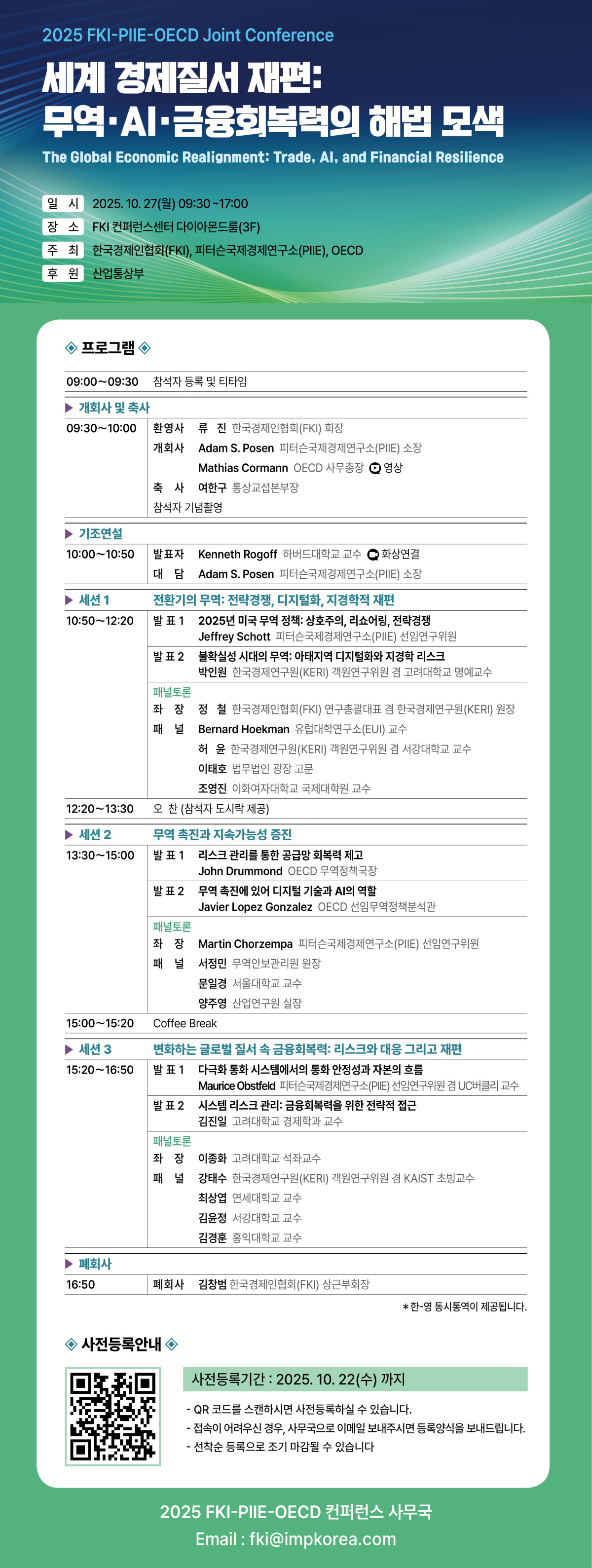ÇѰæÇù°ú ¹Ì±¹ ÇÇÅͽ¼±¹Á¦°æÁ¦¿¬±¸¼Ò(PIIE), °æÁ¦Çù·Â°³¹ß±â±¸(OECD)°¡ °øµ¿ °³ÃÖÇÏ´Â À̹ø ÄÁÆÛ·±½º´Â ¡®¼¼°è °æÁ¦Áú¼ ÀçÆí: ¹«¿ª, ÀΰøÁö´É(AI), ±ÝÀ¶ ȸº¹·ÂÀÇ ÇØ¹ý ¸ð»ö¡¯À» ÁÖÁ¦·Î ±¹³»¿Ü ÃÖ°í Àü¹®°¡¸¦ ÃÊûÇÑ´Ù.