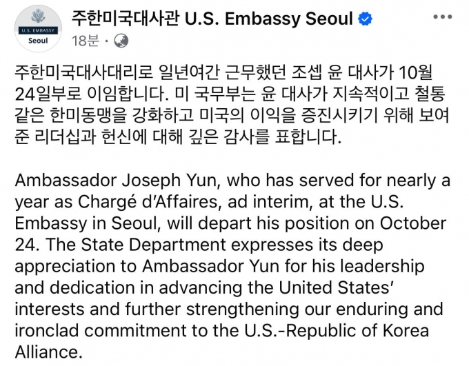 Á¶¼Á À± ÁÖÇѹ̱¹´ë»ç´ë¸®°¡ ¿À´Â 24ÀÏ ÀÌÀÓÇÑ´Ù°í ÁÖÇѹ̱¹´ë»ç°üÀÌ °ø½Ä ¹ßÇ¥Çß´Ù.