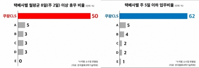 Áö³ 7¿ù Çѱ¹¹°·ù°úÇбâ¼úÇÐȸ°¡ ¹è¼Û±â»ç CLS¿Í CJ´ëÇÑÅë¿î¡¤·ÎÁ¨ÅÃ¹è µî 6°³ Åùè»ç À§Å¹±â»ç 1203¸íÀ» ´ë»óÀ¸·Î Á¶»çÇÑ °á°ú ÄíÆÎCLSÀÇ ¿ùÆò±Õ 5ÀÏ ÈÞ¹« ºñÀ²Àº 66.7%¿´°í, ¿ùÆò±Õ 8ÀÏ(ÁÖ´ç 2ÀÏ) ÈÞ¹« »ç¿ë ºñÀ²µµ 49.7%·Î Á¶»ç ´ë»ó ¾÷ü Áß °¡Àå ³ô¾Ò´Ù.
