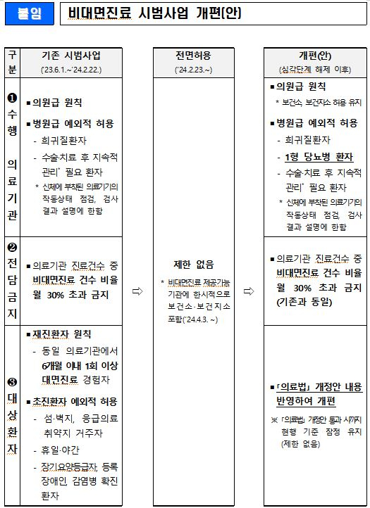 Á¤ºÎ°¡ º¸°ÇÀÇ·á À§±â°æº¸ ½É°¢´Ü°è ÇØÁ¦¿¡ µû¶ó ºñ´ë¸é Áø·á °¡´É ¹üÀ§¸¦ ´Ù½Ã Á¦ÇÑÇϱâ·Î Çß´Ù. ÀÇÁ¤°¥µî »çÅ·Πº´¿ø±Þ±îÁö ºñ´ë¸é Áø·á°¡ °¡´ÉÇßÁö¸¸ ¿À´Â 27ÀϺÎÅÍ´Â ÀÇ¿ø±Þ ÀÇ·á±â°üÀ» Áß½ÉÀ¸·Î ºñ´ë¸é Áø·á°¡ °¡´ÉÇÏ´Ù. º´¿ø±ÞÀº Èñ±ÍÁúȯÀÚ, ¼ö¼ú ÈÄ Áö¼Ó °ü¸®°¡ ÇÊ¿äÇÑ È¯ÀÚ, 1Çü ´ç´¢º´ ȯÀÚ¸¸ ºñ´ë¸é Áø·á°¡ °¡´ÉÇÏ´Ù. ºñ´ë¸é Áø·á ÃÊÁøÀº ±×´ë·Î Çã¿ëÇÑ´Ù.