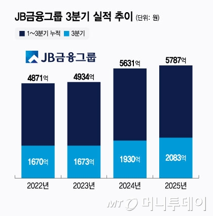 JB±ÝÀ¶±×·ìÀº 28ÀÏ ¿ÃÇØ 3ºÐ±â±îÁö ´©Àû ´ç±â¼øÀÌÀÍ 5787¾ï¿øÀ» ´Þ¼ºÇß´Ù°í °ø½ÃÇß´Ù. Áö³ÇØ °°Àº ±â°£(5631¾ï¿ø) ´ëºñ 2.8% Áõ°¡Çß´Ù. 3ºÐ±â¸¸ ³õ°í ºÁµµ 2083¾ï¿øÀ¸·Î Áö³ÇØ 3ºÐ±â(1930¾ï¿ø) ´ëºñ 7.9% ´Ã¾ú´Ù. ´©Àû ±âÁذú ºÐ±â ±âÁØ ¸ðµÎ ¿ª´ë ÃÖ´ë´Ù.