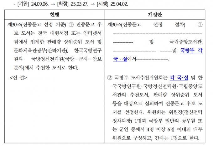 ÁøÁß¹®°í ¼±Á¤ ±âÁØÀº ±¹¹æºÎ ÈÆ·É¿¡ µû¶ó Àü±¹ ´ëÇü¼Á¡ ¶Ç´Â ÀÎÅÍ³Ý ¼Á¡¿¡¼ Áý°èÇÑ ÆÇ¸Å·® »óÀ§¼øÀ§ µµ¼¿Í ±¹¸³Áß¾Óµµ¼°ü¡¤Çѱ¹±¹¹æ¿¬±¸¿ø¡¤±¹¹æÁ¤½ÅÀü·Â¿ø µîÀÌ ÃßõÇÑ µµ¼¸¦ ½ÉÀÇÇØ ¼±Á¤µÆ´Ù. ±×·±µ¥ ±¹¹æºÎ´Â Áö³ÇØ 9¿ù ÈÆ·É °³Á¤ ÀÛ¾÷À» ÅëÇØ »õ·Î¿î Á¶Ç×À¸·Î '±¹¹æºÎ µµ¼ÃßõÀ§¿øÈ¸´Â °¢ ±¹¡¤½Ç' µîÀÇ ¹®±¸¸¦ ³Ö¾ú´Ù.