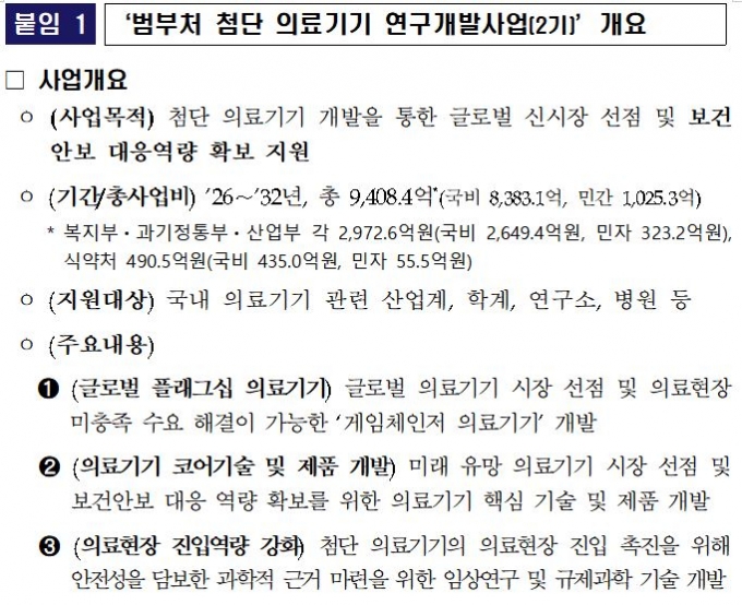 ½ÄǰÀǾàǰ¾ÈÀüó, º¸°Çº¹ÁöºÎ, °úÇбâ¼úÁ¤º¸Åë½ÅºÎ, »ê¾÷Åë»óºÎ´Â 2026³âºÎÅÍ 2032³â±îÁö 7³â°£ ÃÑ 9408¾ï¿ø(±¹°í 8383¾ï¿ø, ¹ÎÀÚ 1025¾ï¿ø)À» ÅõÀÔÇÏ´Â '¹üºÎó ÷´Ü ÀÇ·á±â±â ¿¬±¸°³¹ß»ç¾÷(2±â)'À» ÃßÁøÇÑ´Ù°í 5ÀÏ ¹àÇû´Ù.