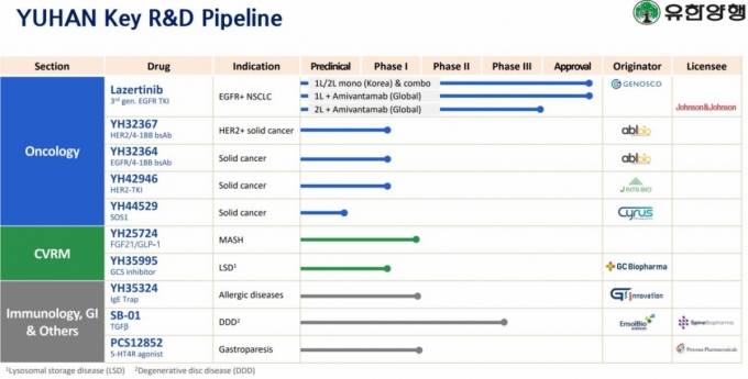¿¬±¸°³¹ß(R&D)µµ Ȱ¹ßÈ÷ ÁøÇàµÇ°í ÀÖ´Ù´Â °Ô À¯ÇѾçÇà ¼³¸íÀÌ´Ù. ȸ»ç °ü°èÀÚ´Â "ÁÖ¿ä ÆÄÀÌÇÁ¶óÀÎ(½Å¾àÈĺ¸¹°Áú)ÀÇ °¡Ä¡¸¦ ³ôÀ̱â À§ÇÑ °³¹ßÀÌ ¼øÁ¶·Ó°Ô ÁøÇà Áß"À̶ó¸ç "'³Ø½ºÆ® ·º¶óÀÚ'·Î ¼ºÀåÇϰí ÀÖ´Â ¾Ë·¹¸£±â Ä¡·áÁ¦ '·¹½Ã°Ô¸£¼ÁÆ®'°¡ ÃÖ±Ù ½ÄǰÀǾàǰ¾ÈÀüó·ÎºÎÅÍ ÀÓ»ó 2»ó ½ÃÇè°èȹÀ» ½ÂÀι޴ µî ´Ù±¹°¡ ÀÓ»óÀ» ÁøÇàÇÒ ¿¹Á¤"À̶ó°í ¸»Çß´Ù. À̾î "FGF21°ú ±Û·çÄ«°ï À¯»ç ÆéŸÀ̵å(GLP)-1 ÀÌÁßÀÛ¿ëÁ¦ 'YH25724'ÀÇ ÈÄ¼Ó ÀÓ»óÀ» ±âȹÇϰí ÀÖÀ¸¸ç, °³¹ß ÁßÀÎ °æ±¸¿ë ÀúºÐÀÚ GLP-1 ºñ¸¸ Ä¡·áÁ¦¸¦ ¿¬¸»±îÁö ÃÖÀû ¼±µµ¹°ÁúÀ» È®º¸ÇÒ °èȹ"À̶ó°í ¹àÇû´Ù.