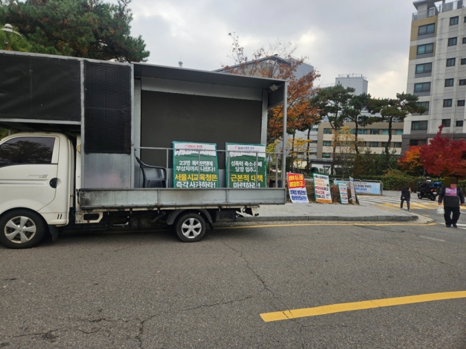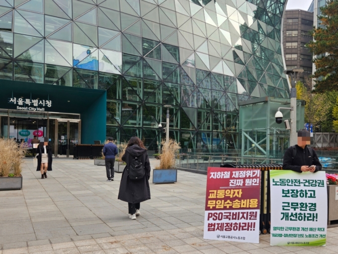 13ÀÏ ¿ÀÀü Áß±¸ ¼¿ï½Ãû ¾Õ¿¡´Â ¼¿ï±³Åë°ø»ç³ëµ¿Á¶ÇÕ °ü°èÀÚ 3¸íÀÌ ÇÇÄÏ ½ÃÀ§¸¦ À̾´Ù. À̵éÀº Àü³¯ ¼¿ï½Ãû ¼¼Ò¹® º°°ü ¾Õ¿¡¼ 3000¸íÀÌ ¸ðÀÎ °¡¿îµ¥ È®¼º±â¿Í Ç÷¡Ä«µå¸¦ µé°í 'ÀÓ´ÜÇù ¼º½Ç ±³¼·'À» Ã˱¸ÇÑ ´Üü´Ù.