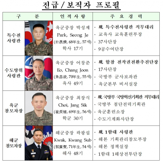 ÇØ±º¿¡¼´Â ¡â°û±¤¼· ¼ÒÀåÀÌ ÇØ±ºÂü¸ðÂ÷Àå ¡â¹Ú±Ô¹é ¼ÒÀåÀÌ ÇØ±º»ç°üÇб³Àå ¡â°µ¿±¸ ¼ÒÀåÀÌ ÇÕÂü Àü·«±âȹº»ºÎÀåÀ¸·Î Áø±Þ¡¤º¸Á÷Çß´Ù. °ø±ºÀº ¡â±Ç¿µ¹Î ¼ÒÀåÀÌ ±³À°»ç·É°ü ¡â±èÁØÈ£ ¼ÒÀåÀÌ ±¹¹æÁ¤º¸º»ºÎÀå ¡â±¸»ó¸ð ¼ÒÀåÀÌ ÇÕÂü ±º»çÁö¿øº»ºÎÀåÀ¸·Î Áø±Þ¡¤º¸Á÷ÀÌ ÀÌ·ïÁ³´Ù.