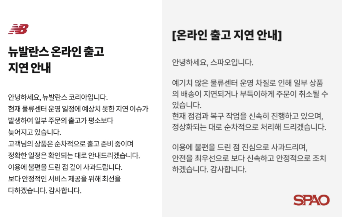 ÀÌ·£µåÆÐ¼ÇÀÌ Àü°³ÇÏ´Â ºê·£µå ½ºÆÄ¿À µîÀÇ È¨ÆäÀÌÁö¿¡µµ ÀÌ¿Í °°Àº °øÁö¹®ÀÌ °ÔÀçµÆ´Ù. õ¾È ¹°·ù¼¾ÅÍ¿¡¼´Â ´º¹ß¶õ½º, ½ºÆÄ¿À, ÈľÆÀ¯ µî 10°³ ºê·£µå¸¦ º¸°üÇϰí ÀÖ¾î, ÇØ´ç ºê·£µåÀÇ »óǰ ¹è¼ÛÀÌ Áö¿¬µÉ °ÍÀ¸·Î ¿¹»óµÈ´Ù.