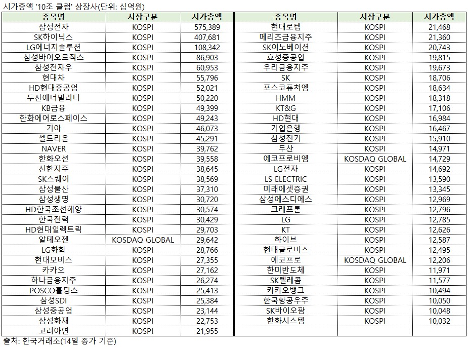 ¶Ç, LSÀÏ·ºÆ®¸¯(¾à 13Á¶6000¾ï ¿ø), ¹Ì·¡¿¡¼ÂÁõ±Ç(¾à 13Á¶3000¾ï ¿ø), Çö´ë±Û·Îºñ½º(¾à 12Á¶5000¾ï ¿ø), ¿¡ÄÚÇÁ·Î, Çѹ̹ݵµÃ¼(¾à 12Á¶ ¿ø), Çѱ¹Ç×°ø¿ìÁÖ(¾à 10Á¶ ¿ø), SK¹ÙÀÌ¿ÀÆÊ(¾à 10Á¶ ¿ø), ÇÑȽýºÅÛ(¾à 10Á¶ ¿ø) µîµµ 10Á¶ Ŭ·´¿¡ »õ·Î À̸§À» ¿Ã·È´Ù. ±× µÚ·Î´Â À¯ÇѾçÇà(9Á¶9961¾ï ¿ø), »ï¾ç½Äǰ(9Á¶9436¾ï ¿ø), S-Oil(9Á¶6483¾ï ¿ø) µîÀÌ ¹Ù½Ï µÚµû¸£¸ç 10Á¶ Ŭ·´ ÁøÀÔÀ» ±â´Ù¸®°í ÀÖ´Ù.