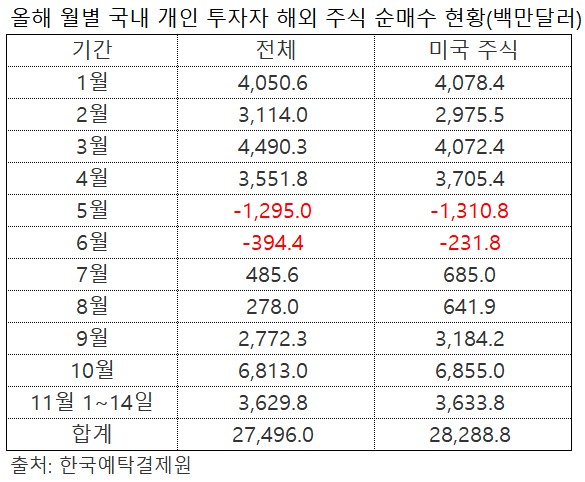 ÃÖ±Ù ±¹³» °³ÀÎ ÅõÀÚÀÚµéÀÇ ÇØ¿Ü ÁÖ½Ä ¼ø¸Å¼ö´Â ¿Ü±¹ÀÎ ÅõÀÚÀÚµéÀÇ ±¹³» ÁÖ½Ä ¼ø¸Åµµ¿Í µ¿½Ã¿¡ È®´ëµÇ´Â È帧ÀÌ¾î¼ ´õ¿í ÁÖ¸ñµÈ´Ù. Çѱ¹°Å·¡¼Ò µî¿¡ µû¸£¸é ¿Ü±¹ÀÎ ÅõÀÚÀÚµéÀº ÀÌ´Þ µé¾î 14ÀϱîÁö À¯°¡Áõ±Ç½ÃÀå¿¡¼ ´ë±Ô¸ð Â÷ÀͽÇÇö¿¡ ³ª¼ ´©Àû 9Á¶1278¾ï ¿ø ¼ø¸Åµµ¸¦ ±â·ÏÇß´Ù.
