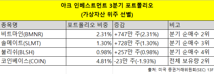 16ÀÏ ¹Ì±¹ Áõ±Ç°Å·¡À§¿øÈ¸(SEC) 13F º¸°í¼¿¡ µû¸£¸é ¾ÆÅ©Àκ£½ºÆ®¸ÕÆ®´Â 3ºÐ±â¿¡ ºñÆ®¸¶ÀÎ(BMNRD)°ú ¼Ö¸ÞÀÌÆ®(SLMT), ºÒ¸®½¬(BLSH)¸¦ Æ÷Æ®Æú¸®¿À¿¡ »õ·Ó°Ô ÆíÀÔÇß´Ù. ¼¼ Á¾¸ñ ¸ðµÎ °¡»óÀÚ»ê °ü·Ã ±â¾÷À¸·Î, À̹ø ºÐ±â ¾ÆÅ©ÀÇ ¼ø¸Å¼ö »óÀ§ 2~4À§¸¦ ³ª¶õÈ÷ Â÷ÁöÇß´Ù.