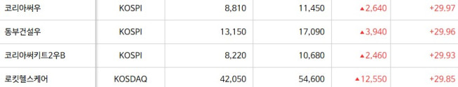 17ÀÏ Çѱ¹°Å·¡¼Ò¿¡ µû¸£¸é ÄÚ½ºÇÇ¿¡¼ ¡âÄÚ¸®¾Æ½á¿ì ¡âÄÚ¸®¾Æ½áŰƮ2¿ìB ¡âµ¿ºÎ°Ç¼³¿ì µîÀÌ »óÇѰ¡¸¦ ±â·ÏÇß´Ù. ¹Ý¸é, ÇÏÀÌÆÛÄÚÆÛ·¹À̼ÇÀº ÇÏÇѰ¡¸¦ ±â·ÏÇß´Ù. ÄÚ½º´Ú¿¡¼´Â ·ÎŶÇコÄɾ °¡°ÝÁ¦ÇÑÆø±îÁö »ó½ÂÇß´Ù.