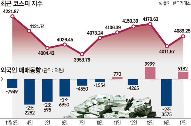 AI ¹öºí ³í¶õÀÌ ÁøÁ¤µÇÀÚ ¿Ü±¹ÀÎ ÅõÀÚÀÚ°¡ ´ë°Å ¸Å¼ö¿¡ ³ª¼¸ç ±¹³» Áõ½Ã°¡ ÇÏ·ç ¸¸¿¡ ¹ÝµîÇß´Ù. ¿Ü±¹ÀÎÀÌ À¯°¡Áõ±Ç½ÃÀå¿¡¼ 5000¾ï ¿ø ³Ñ°Ô »çµéÀÌÀÚ ÅõÀڽɸ®°¡ ȸº¹µÆ°í, »ï¼ºÀüÀÚ¿Í SKÇÏÀ̴нº°¡ °¢°¢ ¡®10¸¸ÀüÀÚ¡¯¿Í ¡®60¸¸´Ð½º¡¯ ÀÚ¸®¸¦ µÇãÀ¸¸ç Áö¼ö »ó½ÂÀ» °ßÀÎÇß´Ù. ¡®AI ¹öºí¡¯ ºÒ¾È°¨¿¡ ±Þ¶ôÇß´ø ÄÚ½ºÇÇ´Â À̳¯ ¹Ýµî¿¡ ¼º°øÇÏ¸é¼ 4080¼±À» ȸº¹ÇÑ Ã¤ °Å·¡¸¦ ¸¶ÃÆ´Ù.