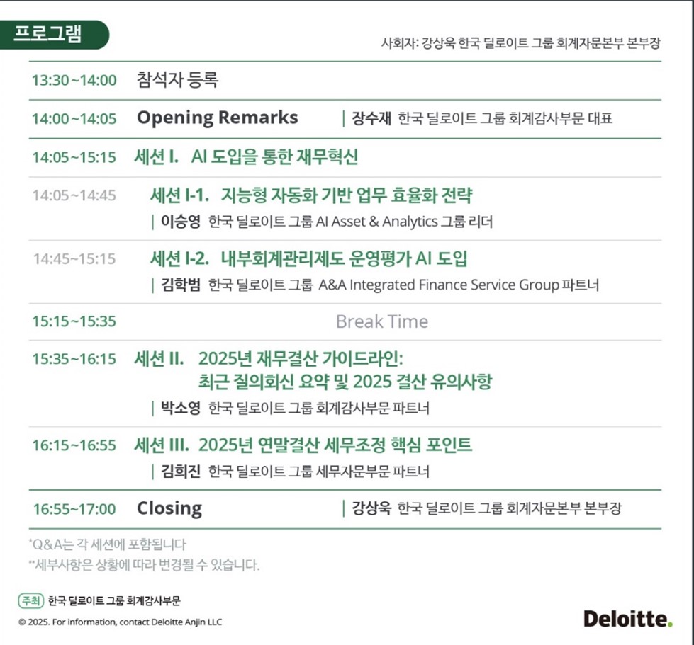Àå¼öÀç Çѱ¹ µô·ÎÀÌÆ®±×·ì ȸ°è°¨»çºÎ¹® ´ëÇ¥´Â "À̹ø ¼¼¹Ì³ª´Â AI ±â¹Ý À繫Çõ½ÅºÎÅÍ 2025ȸ°è¿¬µµ À繫¡¤¼¼¹« °á»ê ÇÙ½É Æ÷ÀÎÆ®±îÁö, ±â¾÷ÀÌ Á÷¸éÇÑ °á»êȯ°æ º¯ÈÀÇ ´ëÀÀ¹æ¾ÈÀ» Æø³Ð°Ô ´Ù·ç´Â ÀÚ¸®"¶ó¸ç "Âü¼®ÀÚµéÀÌ À̹ø ¼¼¹Ì³ª¸¦ ÅëÇØ ½Ç¹«ÀûÀ¸·Î À¯¿ëÇÑ ÀλçÀÌÆ®¸¦ ¾ò°í, ±â¾÷ÀÇ È¸°è Åõ¸í¼º°ú ½Å·Ú¼º Á¦°í¿¡ ½ÇÁúÀûÀÎ µµ¿òÀ» ¹ÞÀ» ¼ö ÀÖÀ» °ÍÀ¸·Î ±â´ëÇÑ´Ù"°í ÀüÇß´Ù.
