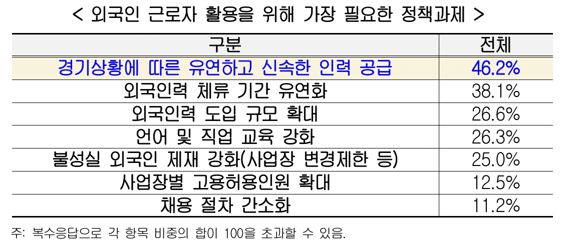 ¿Ü±¹ÀÎ ±Ù·ÎÀÚ È°¿ëÀ» À§ÇØ ÇÊ¿äÇÑ Á¤Ã¥°úÁ¦·Î´Â ¡®°æ±â »óȲ¿¡ µû¸¥ À¯¿¬ÇÏ°í ½Å¼ÓÇÑ Àη °ø±Þ¡¯ÀÌ 46.2%·Î °¡Àå ¸¹ÀÌ ¼±ÅõƴÙ.