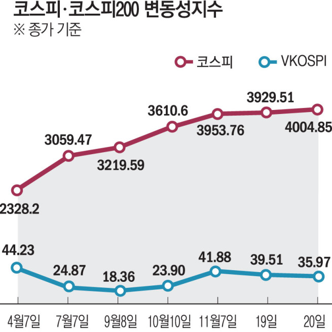 AI ¹ÝµµÃ¼ÁÖ ¹Ýµî¿¡ Áö¼ö ȸº¹ 11¿ù VKOSPI 40¼± µ¹ÆÄ 'ºÒ¾È ½É¸® ÃÖ°íÁ¶' 4¿ù źÇÙ Á÷ÈÄ 7°³¿ù ¸¸¿¡ ÃÖ°íÄ¡ ¡°¹Ýµî¿¡µµ ¸®½ºÅ© °ü¸® Çʼö¡±
