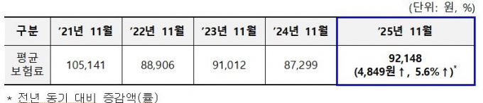 ¿ÃÇØ 11¿ù Áö¿ª°¡ÀÔÀÚ Æò±Õº¸Çè·á´Â 9¸¸2148¿øÀ¸·Î Àü³â ´ëºñ 4849¿ø(5.6%) Áõ°¡Çß´Ù. ´Ù¸¸ ÃÖ±Ù 4³â Æò±Õ(9¸¸3090¿ø)¿¡ ºñÇØ¼´Â ¼ÒÆø ³·Àº ¼öÁØÀÌ´Ù.