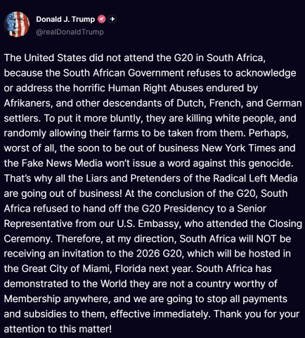 Æ®·³ÇÁ ´ëÅë·ÉÀº ¹Ì±¹ÀÌ ¿ÃÇØ G20 Á¤»óȸÀÇ¿¡ Âü¼®ÇÏÁö ¾ÊÀº ÀÌÀ¯¿¡ ´ëÇØ "³²¾Æ°ø Á¤ºÎ°¡ ¾ÆÇÁ¸®Ä«³Ê½º(Afrikaners)¿Í ´Ù¸¥ ³×´ú¶õµå, ÇÁ¶û½º, µ¶ÀÏ Á¤Âø¹Î ÈļյéÀÌ °ßµ®¿Â ²ûÂïÇÑ ÀÎ±Ç Ä§ÇØ¸¦ ÀÎÁ¤Çϰųª ÇØ°áÇÏ´Â °ÍÀ» °ÅºÎÇ߱⠶§¹®"À̶ó¸ç "´õ Á÷¼³ÀûÀ¸·Î À̾߱âÇÏ¸é ±×µé(³²¾Æ°ø Á¤ºÎ)Àº ¹éÀÎÀ» »ìÇØÇϰí, À̵éÀÇ ³óÀåÀ» ¹«ÀÛÀ§·Î »©¾Ñ´Â °ÍÀ» Çã¿ëÇϰí ÀÖ´Ù"°í ÁÖÀåÇß´Ù. ¾ÆÇÁ¸®Ä«³Ê½º´Â 17¼¼±â ³²¾Æ°øÀ¸·Î ÀÌÁÖÇÑ ³×´ú¶õµå Á¤Âø¹Î Áý´ÜÀ» ¶æÇÑ´Ù.