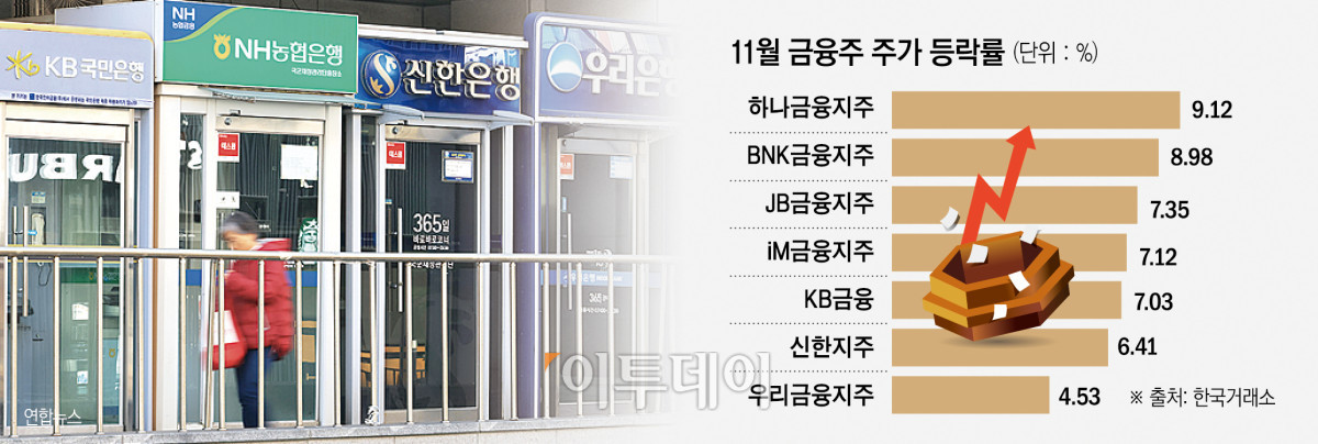 30ÀÏ Çѱ¹°Å·¡¼Ò¿¡ µû¸£¸é ¡®KRX ÀºÇà Áö¼ö¡¯´Â 11¿ù µé¾î 5.89% »ó½ÂÇß´Ù. Àüü KRX Áö¼ö Áß »ó½Â·ü 3À§¿¡ ÇØ´çÇÏ´Â ±â·ÏÀÌ´Ù. °°Àº ±â°£ Á¾¸ñº°·Î´Â Çϳª±ÝÀ¶ÁöÁÖ(9.12%), BNK±ÝÀ¶ÁöÁÖ(8.98%), JB±ÝÀ¶ÁöÁÖ(7.35%), iM±ÝÀ¶ÁöÁÖ(7.12%), KB±ÝÀ¶(7.03%), ½ÅÇÑÁöÁÖ(6.41%), ¿ì¸®±ÝÀ¶ÁöÁÖ(4.53%) µîÀÇ »ó½Â ÆøÀÌ µÎµå·¯Á³´Ù.
