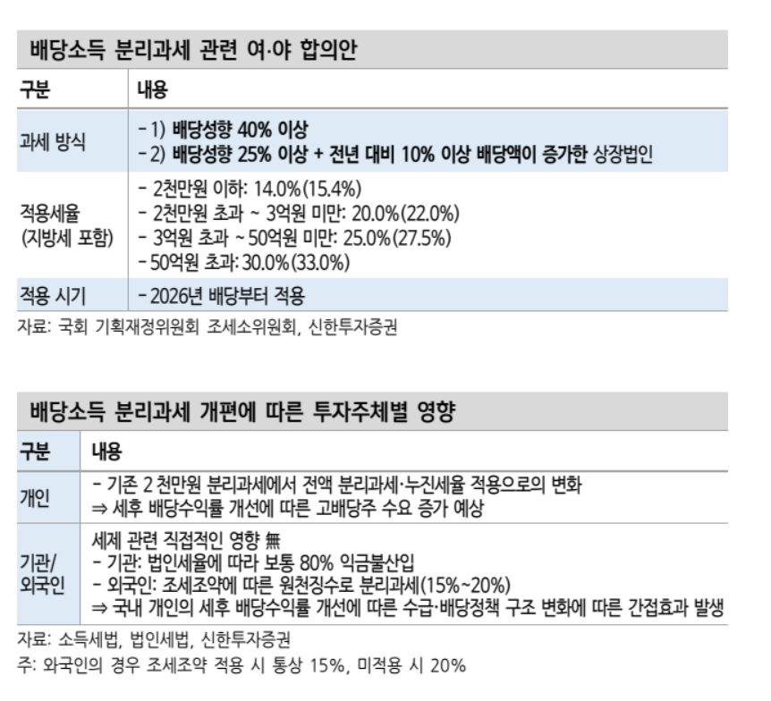 À̹ø ÇÕÀǾȿ¡ µû¸£¸é °í¹è´ç ±â¾÷ÀÇ ¹è´ç¼Òµæ¿¡ ´ëÇØ 2000¸¸ ¿ø ÀÌÇÏ 14%, 2000¸¸~3¾ï ¿ø ÀÌÇÏ 20%, 3¾ï~50¾ï ¿ø ÀÌÇÏ 25%, 50¾ï ¿ø ÃʰúºÐÀº 30% ¼¼À²(Áö¹æ¼¼ Á¦¿Ü)ÀÌ Àû¿ëµÈ´Ù. °í¹è´ç ±â¾÷Àº ¡â¹è´ç¼ºÇâ 40% ÀÌ»ó(¿ì¼öÇü) ¡â¹è´ç¼ºÇâ 25% ÀÌ»óÀÌ¸é¼ Àü³â ´ëºñ 10% ÀÌ»ó Áõ°¡ÇÑ ¹ýÀÎ(³ë·ÂÇü)ÀÌ ÇØ´çµÈ´Ù. ½ÃÇà ½Ã±â´Â ±âÁ¸ Á¤ºÎ¾Èº¸´Ù 1³â ¾Õ´ç°ÜÁø 2026³â °á»ê¹è´çºÎÅÍ Àû¿ëµÈ´Ù.