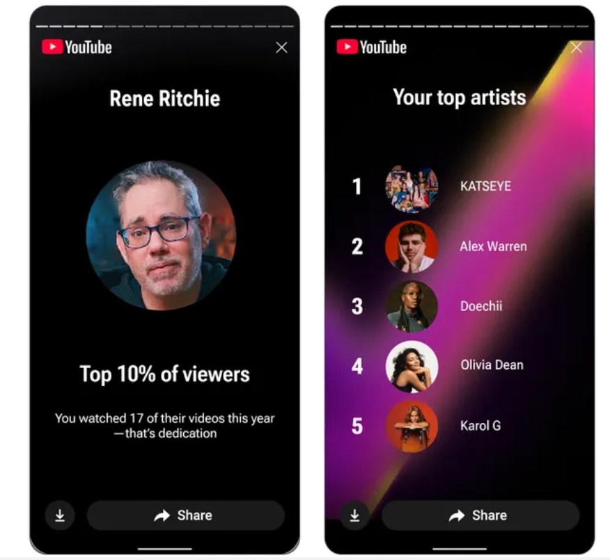 À¯Æ©ºê ¾Û°ú À¯Æ©ºê ¹ÂÁ÷ ¾Û¿¡¼ °¢°¢ Á¦°øµÈ´Ù. À¯Æ©ºê ¸®Ä¸ º¸´Â ¹æ¹ýÀº À¯Æ©ºê ¾Û¿¡¼ ȸé ÇÏ´ÜÀÇ ¡®³» ÆäÀÌÁö(You)¡¯ ÅÇÀ¸·Î À̵¿ÇÏ¸é ¿ÃÇØ ½Ãû ±â·ÏÀ» ±â¹ÝÀ¸·Î ¸¸µç YouTube Recap Ä«µå¿Í ½ºÅ丮¸¦ È®ÀÎÇÒ ¼ö ÀÖ´Ù. ÀÌ ÆäÀÌÁö¿¡¼´Â ¿¬°£ ½Ãû °æÇâ°ú °ü½É»ç º¯È¸¦ Ä«µå ÇüÅ·Πº¼ ¼ö ÀÖÀ¸¸ç °¢ Åë°è¸¦ °³º° Ä«µå·Î ³»·Á¹Þ°Å³ª °øÀ¯ÇÏ´Â ±â´Éµµ Áö¿øµÈ´Ù.