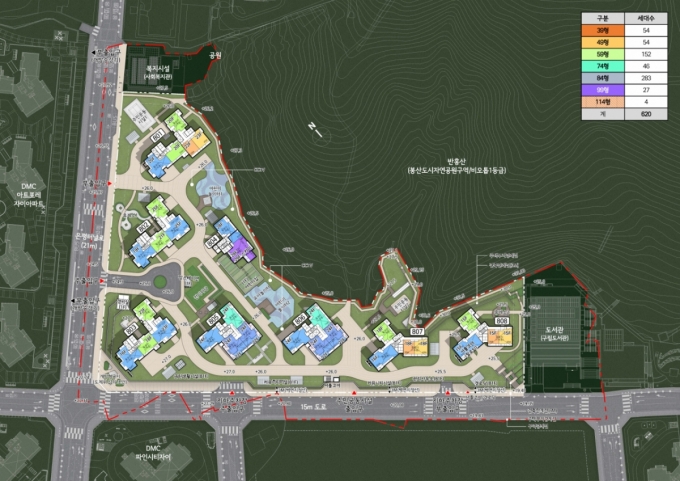 ºÏÃø¿¡´Â ¹ÝÈ«»ê°ú ºÀ»êÀÌ À§Ä¡ÇØ Ä£È¯°æ º¹ÇÕ µµ½ÉÇü ÁÖ°Å´ÜÁö·Î Á¶¼ºµÈ´Ù. °æ»ç°¡ ÀÖ´Â ÁöÇüÀ» »ì·Á ³²Ãø ´ëÁö ÇϺο¡´Â µ¥Å©½Ä ¿¬µ¿ÇüÀ¸·Î ±Ù¸°»ýȰ½Ã¼³°ú Áֹΰøµ¿ÀÌ¿ë½Ã¼³À» ¹èÄ¡ÇØ Ȱ¿ëµµ¸¦ ³ô¿´´Ù. Àü¸éÀº ¿¸° °ø°£°ú ÇÔ²² º¯È°¨ ÀÖ´Â º®¸éÀ¸·Î µðÀÚÀÎÇØ º¸ÇàÀÚ¿¡°Ô ½Ã°¢Àû Áñ°Å¿òÀ» ÁÙ °èȹÀÌ´Ù.