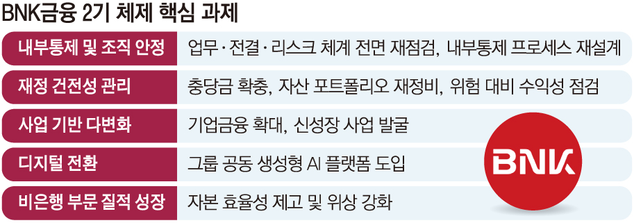 ºó´ëÀΠȸÀåÀÌ ¿¬ÀÓ¿¡ ¼º°øÇÏ¸é¼ BNK±ÝÀ¶Àº ¡®ºó´ëÀÎ 2±â üÁ¦¡¯·Î À̾îÁö°Ô µÆ´Ù. ³»ºÎÅëÁ¦ ÀçÁ¤ºñ¿Í ½ÇÀû¡¤ÁÖÁÖȯ¿ø ¼º°ú°¡ ¿¬ÀÓÀÇ ±â¹ÝÀÌ µÆÁö¸¸ ¾ÕÀ¸·Î BNK±ÝÀ¶ÀÌ ÇØ°áÇØ¾ß ÇÒ ±¸Á¶Àû °úÁ¦µµ ¿©ÀüÈ÷ ³²¾Æ ÀÖ´Ù´Â Æò°¡°¡ ³ª¿Â´Ù.
