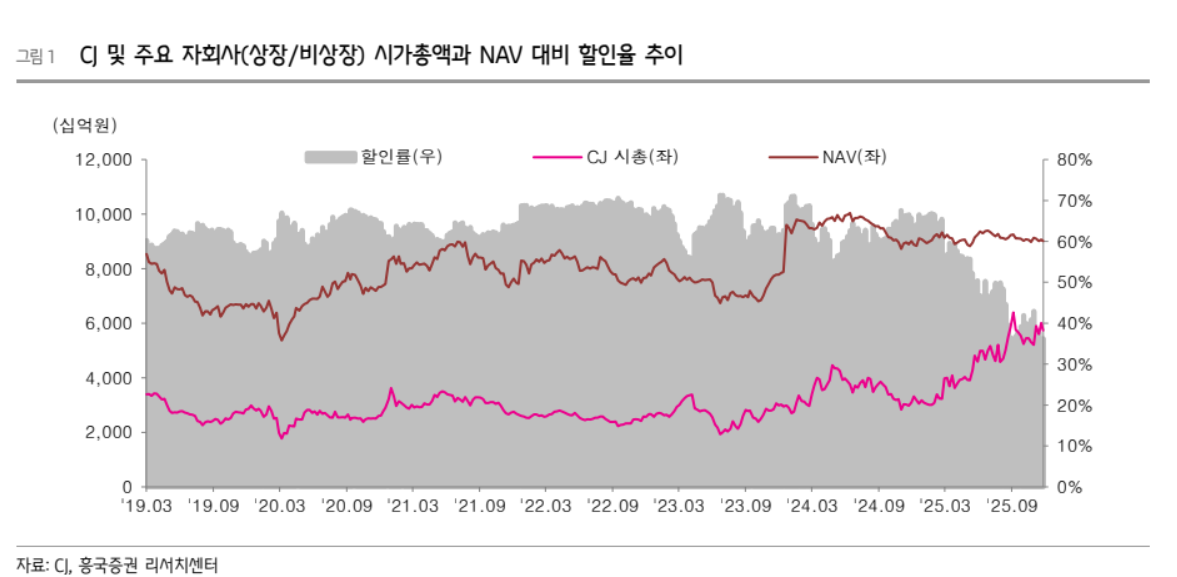 ±×´Â ÀÌ¾î ¡°4¿ù ÀÌÈÄ ÁÖ°¡°¡ »ó½ÂÇßÀ½¿¡µµ ºÒ±¸Çϰí CJÀÇ ¼øÀڻ갡ġ(NAV) ´ëºñ ÇÒÀÎÀ²Àº ¿©ÀüÈ÷ 41% ¼öÁØÀ¸·Î ¹ë·ù¿¡ÀÌ¼Ç ¸Å·ÂÀº ÃæºÐÇÏ´Ù¡±¸ç ¡°4´ë ÇÙ½É »ç¾÷(Culture¡¤Platform¡¤Wellness¡¤Sustainability)À» ÅëÇÑ ¼ºÀåÀü·« °È¿Í ÇÔ²² ÁÖÁÖȯ¿ø È®´ë°¡ ÇâÈÄ ÁÖ°¡ ¸®·¹ÀÌÆÃ(ÀçÆò°¡)ÀÇ ÇÙ½É ¿äÀÎÀÌ µÉ °Í¡±À̶ó°í Áø´ÜÇß´Ù.
