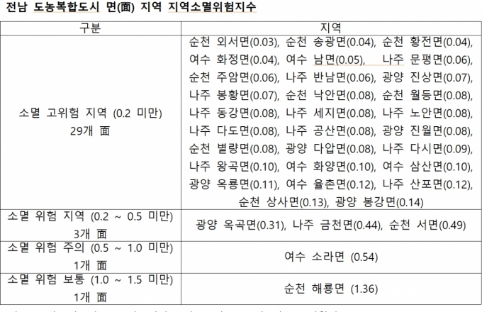 ±è ÀÇ¿ø½Ç¿¡ µû¸£¸é Àü³² 17°³ ±º Áö¿ª Áß ¼Ò¸ê °íÀ§Çè Áö¿ªÀº 14°÷À¸·Î 82%¿¡ ´ÞÇß´Ù. ÀÌ´Â Àü³² µµ³óº¹ÇÕµµ½Ã¿¡ ¼ÓÇÑ ¸é Áö¿ªÀÇ ¼Ò¸ê °íÀ§Çè ºñÀ²(85%)º¸´Ù 3%Æ÷ÀÎÆ® ³·Àº ¼öÁØÀ¸·Î, ÇàÁ¤±¸¿ª»ó '½Ã(ã¼)'¿¡ Æ÷ÇÔµÈ ¸é Áö¿ªÀÇ Àα¸ À§±â°¡ ÀüÅëÀûÀÎ ±º Áö¿ª¸¸Å ½É°¢ÇÔÀ» º¸¿©ÁØ´Ù.