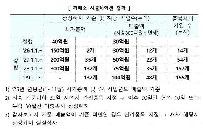 ½Ã°¡ÃÑ¾× »óÀåÆóÁö ¿ä°Çµµ 1¿ùºÎÅÍ È®´ëµÈ´Ù. ½ÃÃÑÀÌ Çö 40¾ï¿ø¿¡¼ ´Ü°èÀûÀ¸·Î 150¾ï¿ø ¹Ì¸¸ÀÌ¸é »óÆó ¿ä°Ç¿¡ ÇØ´çÇÏ°Ô µÈ´Ù. ½Ã¹Ä·¹ÀÌ¼Ç °á°ú ³»³â 14°³»ç°¡ »óÀåÆóÁö ¿ä°Ç¿¡ ÇØ´çÇÏÁö¸¸ ±âÁØ »óÇâÁ¶Á¤ÀÌ ¸¶¹«¸®µÇ´Â 2029³âÀº ÄÚ½º´Ú »óÀå±â¾÷ÀÇ 9.5%ÀÎ 165°³°¡ »óÆó ¿ä°Ç¿¡ ÇØ´çÇÏ°Ô µÈ´Ù.