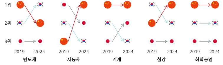 Çѱ¹¹«¿ªÇùȸ ±¹Á¦¹«¿ªÅë»ó¿¬±¸¿øÀº 23ÀÏ ¹ßÇ¥ÇÑ ¡®5´ë ÁÖ·Âǰ¸ñ ÇÑ¡¤Áß¡¤ÀÏ ¼öÃâ°æÀï·Â ºñ±³¡¯ º¸°í¼¸¦ ÅëÇØ 2019³âºÎÅÍ 2024³â±îÁö Áß±¹ÀÌ ¹ÝµµÃ¼¸¦ Á¦¿ÜÇÑ ´ëºÎºÐÀÇ Á¦Á¶¾÷ ºÐ¾ß¿¡¼ Çѱ¹°ú ÀϺ»À» Ãß¿ùÇß´Ù°í ¹àÇû´Ù. º¸°í¼´Â ¹ÝµµÃ¼, ÀÚµ¿Â÷, ±â°è, ö°¡¤ºñö±Ý¼Ó, ÈÇаø¾÷ µî 5´ë Áַ ǰ¸ñÀ» ´ë»óÀ¸·Î ¼öÃâ°æÀï·Â º¯È¸¦ ºÐ¼®Çß´Ù.