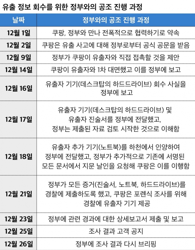 À̾î 9ÀÏ Á¤ºÎ´Â ÄíÆÎÀÌ À¯ÃâÀÚ¿Í Á¢ÃËÇÒ °ÍÀ» Á¦¾ÈÇß´Ù. ÀÌÈÄ 14ÀÏ Á¤º¸ À¯ÃâÀÚ¸¦ óÀ½ ¸¸³µ°í, ÀÌ »ç½ÇÀ» Á¤ºÎ¿¡ º¸°íÇß´Ù. 16ÀÏ¿¡´Â Á¤ºÎÀÇ Áö½Ã¿¡ µû¶ó Á¤º¸ À¯ÃâÀÚÀÇ µ¥½ºÅ©Åé°ú ÇÏµå µå¶óÀ̺긦 1Â÷ ȸ¼öÇØ Á¤ºÎ¿¡ Á¦°øÇß´Ù. ÇÏµå µå¶óÀ̺긦 Á¦ÃâÇÑ ½ÃÁ¡ºÎÅÍ Á¤ºÎ°¡ ÀÌ¿¡ ´ëÇÑ Á¶»ç¿¡ Âø¼öÇÑ °ÍÀ¸·Î ÀÌÇØÇß´Ü °Ô ÄíÆÎ ÃøÀÇ ÁÖÀåÀÌ´Ù. ÄíÆÎÀº "Á¤ºÎ´Â ÄíÆÎ¿¡ Á¤º¸ À¯ÃâÀڷκÎÅÍ Ãß°¡ ±â±â¸¦ ȸ¼öÇØ ´Þ¶ó°í ¿äûÇß´Ù"°í ¹àÇû´Ù.