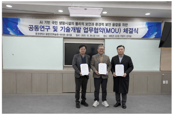 µ¿±¹´ëÇб³ À¶ÇÕ¾ÈÀüÇмú¿ø(¿øÀå ÀÌâÇÑ)ÀÌ 26ÀÏ µ¿±¹´ë ÇýȰü ÁÖÀ±½ÄȦ¿¡¼ ÀΰøÁö´É(AI) ±â¾÷ 'µ¥ÀÌÅæ', ½º¸¶Æ® ¹æ¿ª ±â¾÷ 'Ç»¸®¿ò'°ú ¹Ì·¡Çü À¶ÇÕ º¸¾È ±â¼ú °³¹ßÀ» À§ÇÑ 3ÀÚ ¾÷¹«Çù¾à(MOU)À» Çß´Ù.