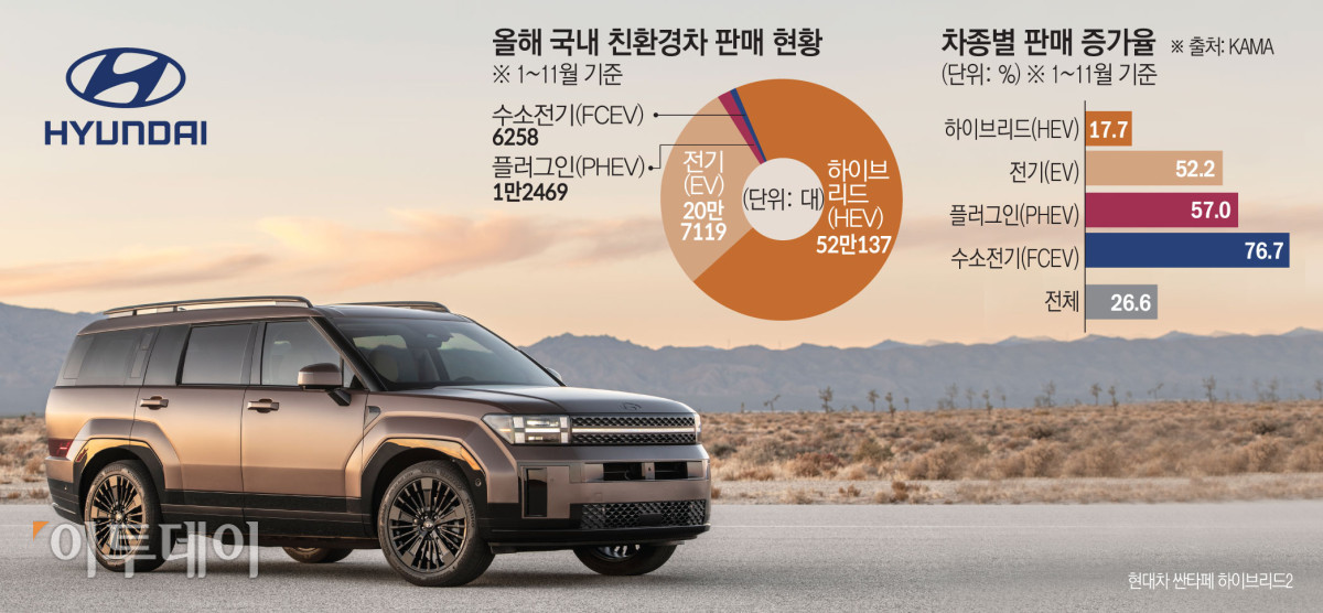 ¼ºÀåÀÇ Á߽ɿ¡´Â ÇÏÀ̺긮µå°¡ ÀÖ´Ù. ¿ÃÇØ 1~11¿ù ±âÁØ ÇÏÀ̺긮µåÂ÷·®ÀÇ ±¹³»ÆÇ¸Å´Â 52¸¸137´ë·Î Àü³â ´ëºñ 17.7% ´Ã¸ç Àüü ģȯ°æÂ÷ÀÇ ¾à 70%¸¦ Â÷ÁöÇß´Ù. Àü±âÂ÷(20¸¸7119´ë¡¤52.2%¡è)¿Í ¼ö¼ÒÀü±âÂ÷(FCEV¡¤6258´ë¡¤76.7%¡è)¸¦ Å©°Ô ¿ôµµ´Â ±Ô¸ð´Ù. ÇÏÀ̺긮µå°¡ »ç½Ç»ó ģȯ°æÂ÷ ½ÃÀåÀÇ ¡®ÁÖ·Â ÆÄ¿öÆ®·¹ÀΡ¯À¸·Î ÀÚ¸® Àâ¾Ò´Ù´Â Àǹ̴Ù.