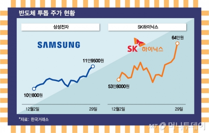 ¹ÝµµÃ¼ ½´ÆÛ»çÀÌŬ ±â´ë°¨ÀÌ Ä¿Áö¸é¼ Áõ½Ã¿¡¼ ¹ÝµµÃ¼ ÁÖ ÅõÅéÀÌ ´Þ·È´Ù. »ï¼ºÀüÀÚ ÁÖ°¡´Â '12¸¸ÀüÀÚ' ÅιرîÁö ¿Ã¶ó¿Ô´Ù. SKÇÏÀ̴нº´Â ÅõÀÚ °æ°í Á¾¸ñ ÇØÁ¦ ù³¯ 6% ÀÌ»ó »ó½ÂÇß´Ù. ±ÝÀ¶ÅõÀÚ¾÷°è Àü¹®°¡µéÀº ³»³â¿¡µµ µÎ Á¾¸ñÀÇ »ó½Â¼¼°¡ °è¼ÓµÉ °ÍÀ̶ó°í Àü¸ÁÇß´Ù.