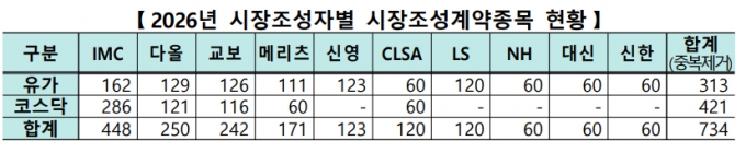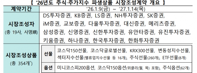 ÀÌ¿¡ µû¶ó ÃÑ 354°³ ÆÄ»ý»óǰ¿¡ ´ëÇØ 2°³ ÀÌ»óÀÇ ½ÃÀåÁ¶¼ºÀÚ°¡ ¹èÁ¤µÈ´Ù. ÀÌµé »óǰÀº ¡âÄÚ½º´Ú150¼±¹° ¡âÄÚ½º´Ú±Û·Î¹ú¼±¹° ¡âKRX300¼±¹° ¡âº¯µ¿¼ºÁö¼ö¼±¹° ¡â¼½ÅÍÁö¼ö¼±¹°(¹ë·ù¾÷Áö¼ö¼±¹° µî 16°³) ¡âÁֽļ±¹°(260°³) ¡âETF¼±¹°(8°³) ¡â¹Ì´ÏÄÚ½ºÇÇ200¿É¼Ç ¡âÄÚ½º´Ú150¿É¼Ç(À§Å¬¸®(¿ù, ¸ñ) Æ÷ÇÔ) ¡âÁֽĿɼÇ(62°³) µîÀÌ´Ù.