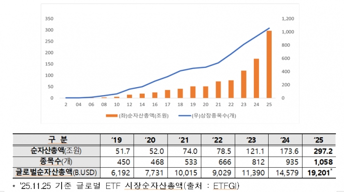 30ÀÏ Çѱ¹°Å·¡¼Ò°¡ °ø°³ÇÑ '2025³â ETF¡¤ETN½ÃÀå °á»ê ¹× ÁÖ¿ä Æ¯Â¡ ºÐ¼®'¿¡ µû¸£¸é ¿ÃÇØ ¸» ETF ¼øÀÚ»êÃѾ×Àº 297Á¶¿øÀ» ±â·ÏÇß´Ù.