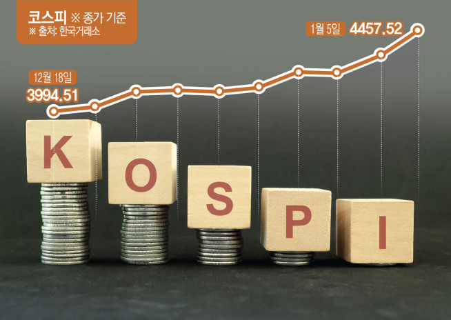 »õÇØ ù °Å·¡ÀϺÎÅÍ »ç»ó ÃÖ°íÄ¡¸¦ °æ½ÅÇϸç 4300¼±À» µ¹ÆÄÇÑ ÄÚ½ºÇÇÀÇ ±â¼¼°¡ ¸ØÃâ ÁÙ ¸ð¸£°í ÀÖ´Ù. 5ÀÏ ÄÚ½ºÇÇ´Â ´Ù½Ã Çѹø ¿ª»çÀÇ ÇÑ ÆäÀÌÁö¸¦ »õ·Î ¾²¸ç 4457.52¿¡ ¾ÈÂøÇß´Ù. ÄÚ½ºÇÇ¿Í ÄÚ½º´Ú ½ÃÀåÀ» ÇÕÄ£ »óÀå»ç ½Ã°¡ÃÑ¾× ÇÕ°èµµ Àü³¯ »ç»ó óÀ½À¸·Î 4000Á¶ ¿øÀ» µ¹ÆÄÇϸç Çѱ¹ Áõ½ÃÀÇ Ã¼±Þ ÀÚü°¡ ÇÑ ´Ü°è ¼ºÀåÇßÀ½À» ¾Ë·È´Ù.