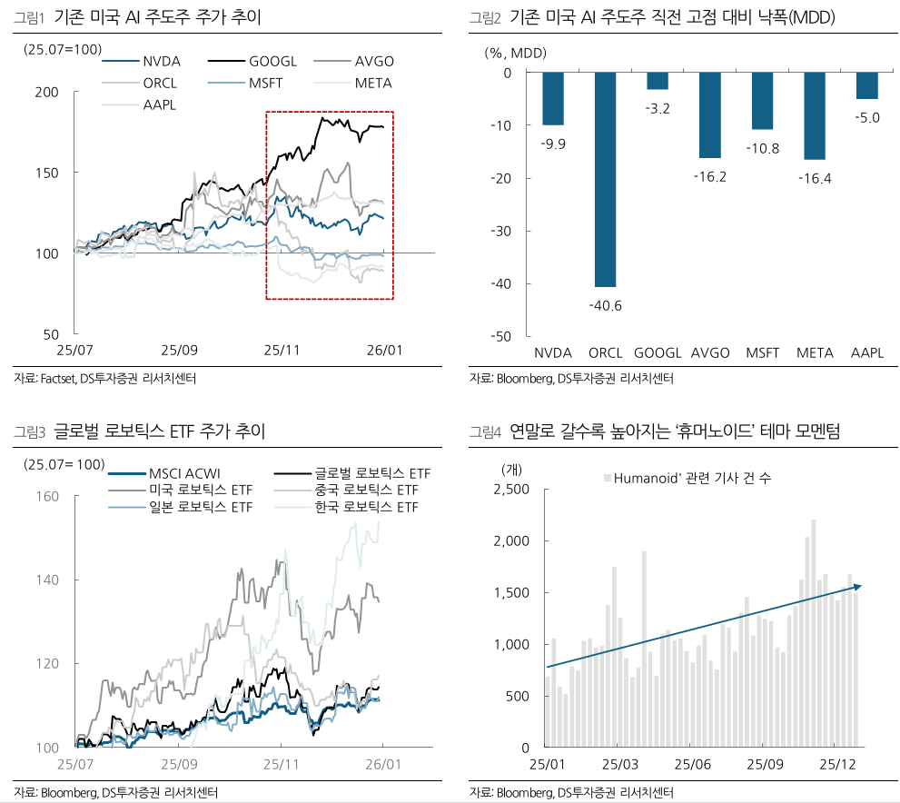 DSÅõÀÚÁõ±ÇÀº ÀÌ·¯ÇÑ È帧ÀÇ ¹è°æÀ¸·Î ±Û·Î¹ú ±â¾÷µéÀÇ ·Îº¸Æ½½º¡¤ÈÞ¸Ó³ëÀÌµå °ü·Ã ÅõÀÚ È®´ë¿Í ¹Ì±¹ Á¤ºÎÀÇ Á¤Ã¥ Áö¿ø °èȹ µî ÀÕµû¸¥ È£À縦 Áö¸ñÇß´Ù. ÈÞ¸Ó³ëÀ̵å´Â ÀΰøÁö´É »ýŰèÀÇ ÀϺηÎ, ¿£ºñµð¾Æ Á¨½¼ Ȳ ÃÖ°í°æ¿µÀÚ(CEO)°¡ Á¦½ÃÇÑ ÀΰøÁö´É ¹ßÀü ´Ü°è(Àνġæ»ý¼º¡æ¿¡ÀÌÀüÆ®¡æÇÇÁöÄÃ) °¡¿îµ¥ ³× ¹øÂ° ´Ü°èÀÎ ¡®ÇÇÁöÄà ÀΰøÁö´É(Physical AI)¡¯ÀÇ ÇÙ½É ±â¼ú¿¡ ÇØ´çÇÑ´Ù´Â ¼³¸íÀÌ´Ù. ÀÌ¿¡ µû¶ó ÇöÀç ½ÃÀå ±¹¸éÀº ÀΰøÁö´É Æ®·»µåÀÇ Á¾·á°¡ ¾Æ´Ï¶ó, °ü½É ÃàÀÌ ±âÁ¸ ÁÖµµ ¿µ¿ª¿¡¼ ÇÇÁöÄà ÀΰøÁö´É ºÐ¾ß·Î È®À塤ÀüȯµÇ´Â °úÁ¤À¸·Î ÇØ¼®ÇÒ ¼ö ÀÖ´Ù´Â ºÐ¼®ÀÌ´Ù.