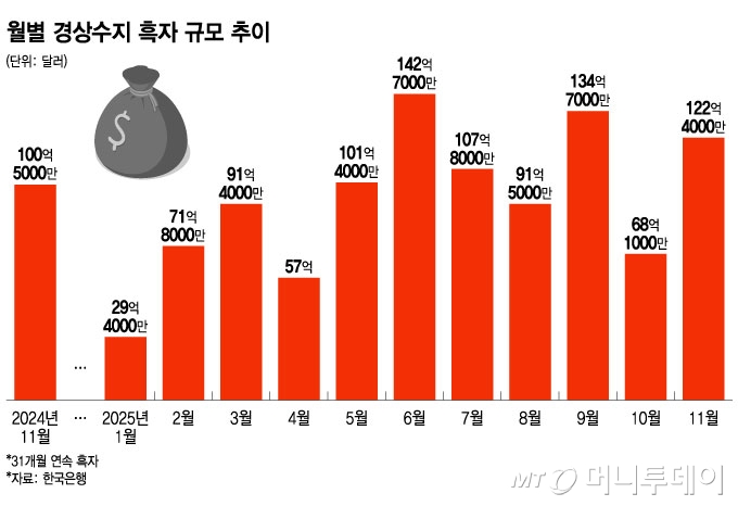 1~11¿ù ´©Àû °æ»ó¼öÁö ÈæÀÚ´Â 1000¾ï´Þ·¯¸¦ Èǽ ³Ñ¾ú´Ù. ¿¬°£ ÃÖ´ë ÈæÀÚ ´Þ¼ºµµ ±âÁ¤»ç½ÇȵƴÙ. Çѱ¹ÀºÇàÀº ¹ÝµµÃ¼ Áß½ÉÀÇ ¼öÃâ È£Á¶¼¼°¡ À̾îÁö¸é¼ ¿ÃÇØ´Â ³»³âº¸´Ù °æ»ó¼öÁö ÈæÀÚ ±Ô¸ð°¡ ´õ È®´ëµÉ °ÍÀ¸·Î Àü¸ÁÇß´Ù.