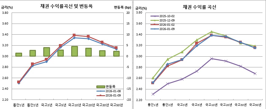 9ÀÏ Ã¤±Ç½ÃÀå°ú ±ÝÀ¶ÅõÀÚÇùȸ¿¡ µû¸£¸é Åë¾È2³â¹°Àº 2.8bp »ó½ÂÇÑ 2.855%¸¦ ±â·ÏÇß´Ù. ±¹°í3³â¹°Àº 4.0bp ¿Ã¶ó 2.942%¿¡ °Å·¡¸¦ ¸¶ÃÆ´Ù. Àü³¯¿¡´Â 2.902%¸¦ ±â·ÏÇϸç Áö³ÇØ 11¿ù¸» ÀÌÈÄ 2°³¿ù¸¸¿¡ ÃÖÀúÄ¡¸¦ °æ½ÅÇß¾ú´Ù. ±¹°í10³â¹°µµ 4.5bp ¿À¸¥ 3.386%¸¦ º¸¿´´Ù. ¿ª½Ã Àü³¯¿¡´Â 3.341%·Î Áö³ÇØ 12¿ù Áß¼ø ÀÌÈÄ ÇÑ´Þ¸¸¿¡ ÃÖÀúÄ¡¸¦ ³ªÅ¸³Â¾ú´Ù. ±¹°íä 30³â¹° µµÇÑ 2.6bp ¿À¸¥ 3.254%¿¡ °Å·¡¸¦ ¸¶ÃÆ´Ù.