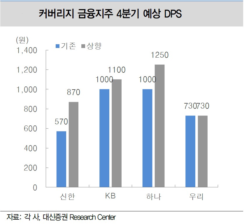 ½ÇÁ¦·Î ½ÃÀåÀÇ ´«³ôÀÌ´Â ÀÌ¹Ì 4ºÐ±â ¹è´ç¾× »óÇâ¿¡ ¸ÂÃçÁ® ÀÖ´Ù. Á¤ºÎÀÇ ¹è´ç¼Òµæ ºÐ¸®°ú¼¼ ÇýÅÃÀ» ¹Þ±â À§ÇØ ÁÖ¿ä ±ÝÀ¶ÁöÁÖµéÀÌ ¹è´ç ¼ºÇâÀ» ³ôÀ̰ųª ¹è´ç±ÝÀ» ´Ã¸± °¡´É¼ºÀÌ Å©±â ¶§¹®ÀÌ´Ù. Áõ±Ç°¡¿¡ µû¸£¸é ½ÅÇÑÁöÁÖ¿Í KB±ÝÀ¶, Çϳª±ÝÀ¶ µîÀº ºÐ¸®°ú¼¼ ¿ä°ÇÀ» ÃæÁ·Çϱâ À§ÇØ 4ºÐ±â DPS¸¦ ÀÌÀü ÃßÁ¤Ä¡º¸´Ù ³ô°Ô Ã¥Á¤ÇÒ °ÍÀ¸·Î ±â´ëµÈ´Ù.