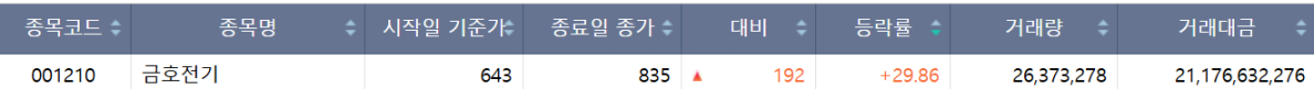 ±ÝÈ£Àü±â´Â Àü °Å·¡ÀÏ ´ëºñ 29.86%(192¿ø) ¿À¸¥ 835¿ø¿¡ °Å·¡¸¦ ¸¶ÃÆ´Ù. °Å·¡·®Àº 2637¸¸ ÁÖ¸¦ ³Ñ°å´Ù.