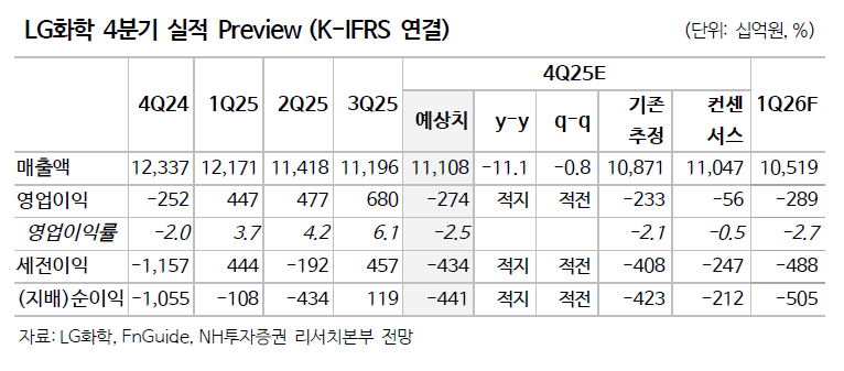 ÃÖ¿µ±¤ NHÅõÀÚÁõ±Ç ¿¬±¸¿øÀº "LGÈÇÐÀº LG¿¡³ÊÁö¼Ö·ç¼ÇÀÇ ¹Ì±¹ °øÀå °¡µ¿·ü ÀúÇÏ, ¶óÀÎ Àüȯ ºñ¿ë ¹ß»ý µîÀ» ¹Ý¿µÇØ 2026³â ¿µ¾÷ÀÌÀÍ Àü¸ÁÄ¡¸¦ ÇÏÇâÇß´Ù"¸ç "LGÈÇÐ ±â¾÷°¡Ä¡ »êÁ¤ ½Ã ¹Ý¿µÇÏ´Â LG¿¡³ÊÁö¼Ö·ç¼ÇÀÇ ¿µ¾÷°¡Ä¡¸¦ ±âÁ¸ 54Á¶ ¿ø¿¡¼ 43Á¶ ¿øÀ¸·Î ÇÏÇâÇß´Ù"°í ¸»Çß´Ù.