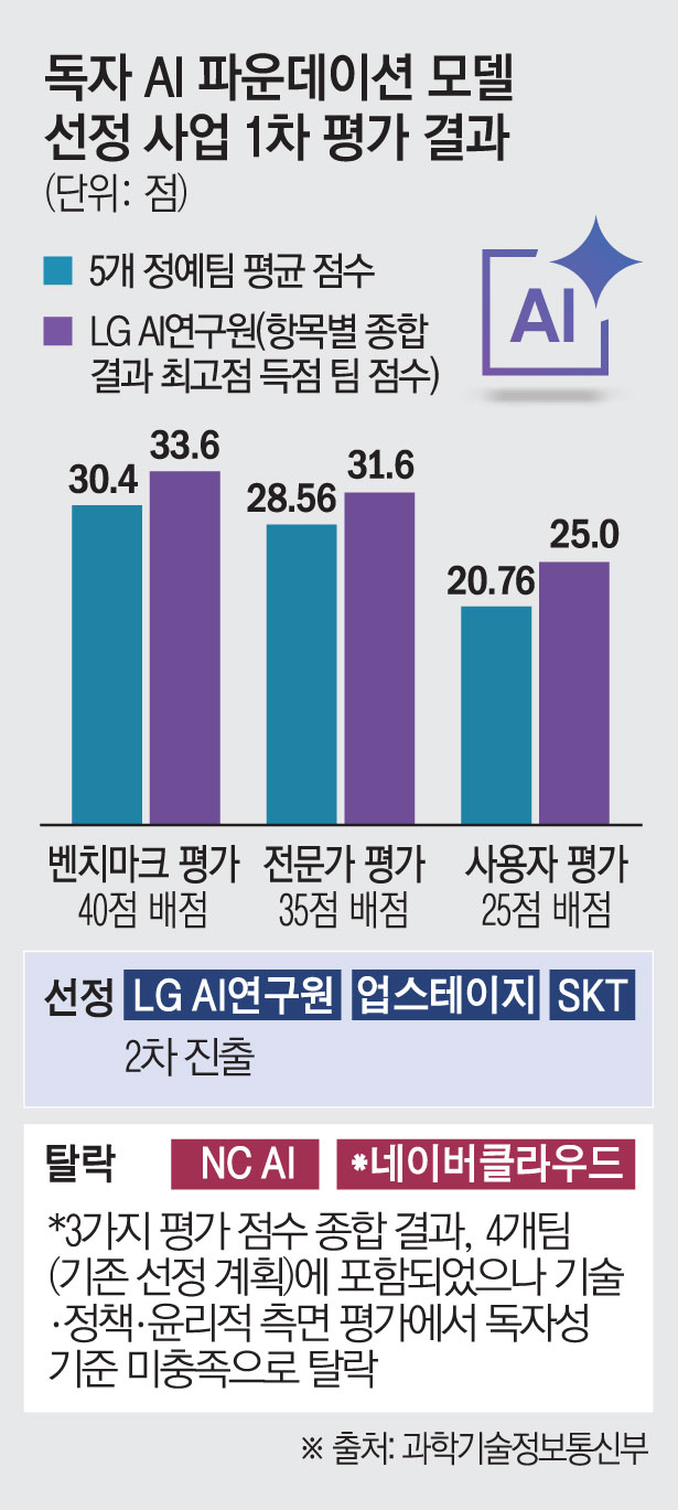 °úÇбâ¼úÁ¤º¸Åë½ÅºÎ´Â 15ÀÏ Á¤ºÎ¼¿ïû»ç¿¡¼ ·ùÁ¦¸í 2Â÷°ü ÁÖÀç·Î ºê¸®ÇÎÀ» ¿¾î 1Â÷ Æò°¡ °á°ú¸¦ À̰°ÀÌ ¹ßÇ¥Çß´Ù. °ú±âÁ¤ÅëºÎ´Â À̹ø Æò°¡¿¡¼ AI º¥Ä¡¸¶Å©(¼ö·®ÈµÈ ±â¼ú ôµµ), Àü¹®°¡ ¹× »ç¿ëÀÚ Æò°¡¸¦ ÁøÇàÇØ AI ¸ðµ¨ ¼º´É, ½ÇÁ¦ ÇöÀå µî¿¡¼ÀÇ È°¿ë °¡´É¼º, ¸ðµ¨ Å©±â µîÀÇ ºñ¿ë È¿À²¼º, ±¹³»¿Ü AI »ýÅÂ°è ÆÄ±Þ È¿°ú µîÀ» Á¾ÇÕÀûÀ¸·Î Æò°¡Çß´Ù. ÀÌ °úÁ¤¿¡¼ LG AI¿¬±¸¿øÀÌ Àü ºÎ¹®¿¡¼ °¡Àå ³ôÀº Á¡¼ö¸¦ ±â·ÏÇß°í ³×À̹öŬ¶ó¿ìµå¿Í SKÅÚ·¹ÄÞ, ¾÷½ºÅ×ÀÌÁö°¡ »óÀ§±Ç¿¡ ¿Ã¶ú´Ù. ´Ù¸¸ ³×À̹öŬ¶ó¿ìµå´Â ¼º´É°ú º°°³·Î µ¶ÀÚ¼º ±âÁØÀ» ÃæÁ·ÇÏÁö ¸øÇß´Ù´Â Á¤Ã¥Àû ÆÇ´Ü¿¡ µû¶ó Å»¶ôÇß´Ù. ¹Ý¸é NC AI´Â µ¶ÀÚ¼º ¹®Á¦´Â Á¦±âµÇÁö ¾Ê¾ÒÀ¸³ª Á¾ÇÕ Á¡¼ö °æÀï¿¡¼ »óÀ§±Ç¿¡ µéÁö ¸øÇØ Á¦¿ÜµÆ´Ù.